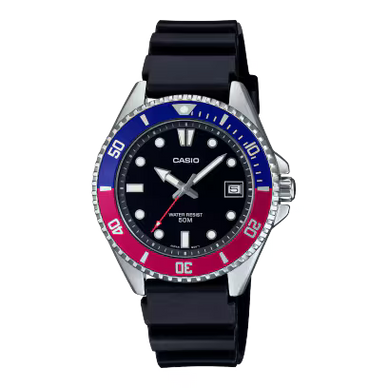 Compact, lightweight, and ready for everyday adventure — the Casio MDV-10-1A2V is a modern take on the fan-favourite MDV diver design. Featuring a sporty black dial, bold markers, and a striking red seconds hand, it delivers instant readability while keeping a clean, minimalist aesthetic.