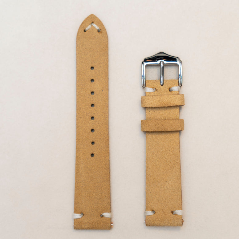 The Handstitched Suede Strap combines soft texture with minimalist design, offering a relaxed yet refined look for everyday wear. Featuring contrast hand-stitching at the lugs and buckle, this strap highlights artisanal detail while remaining understated. Available in 20mm and 22mm sizes, it provides a versatile fit for a wide range of watches.