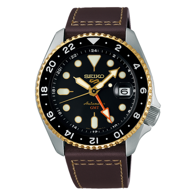 Featuring a black dial and two-tone black-and-brown bezel accented with gold plating, this watch offers both warmth and sophistication. The GMT hand enables quick dual-time tracking, while LumiBrite-coated hands and markers ensure visibility in any light. Built from stainless steel and fitted with a brown calf leather strap, the watch delivers refined style without sacrificing Seiko’s signature durability.
